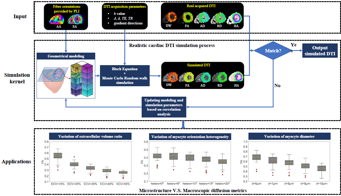 De plus, la diffusion de l'eau dans l'ultrastructure des tissus sera simulée afin d'étudier son impact sur l'imagerie par diffusion en résonance magnétique. La relation entre l'ultrastructure et la fonction cardiaque est également analysée. Des approches de modélisation inverse sont développées pour identifier les propriétés mécaniques individualisées du myocarde et des vaisseaux.