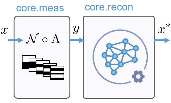 The image $\boldsymbol{f}$ needs to be reconstructed from the full measurement vector $\boldsymbol{m} \in \mathbb{R}^{M}$, given the system matrix $\boldsymbol{A}$ that contains all the light patterns. The current trend consists in designing artificial neural networks to solve the reconstruction task, for which the SPyRiT package may prove useful.