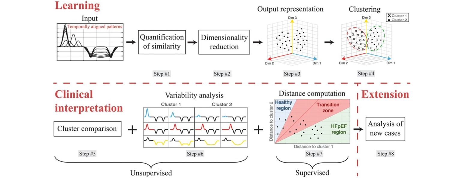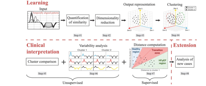 Figure legend: Learning: For each feature, definition of the pairwise similarity between subjects (Step 1); dimensionality reduction through unsupervised learning (Step 2); output representation (Step 3); unsupervised clustering (Step 4). Interpretation: Comparison of clinical indexes between clusters (Step 5); reconstruction of the variability associated with each cluster (Step 6); computation of distances and region discovery (Step 7). Extension: New cases analysis (Step 8). HFpEF indicates heart failure with preserved ejection fraction.