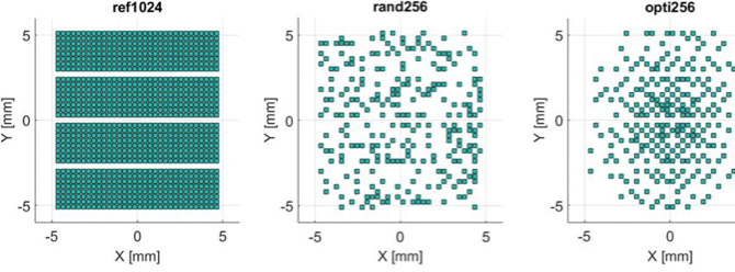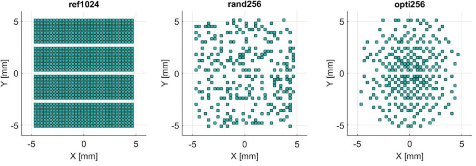 Figure legend: Illustration of the selected layouts: the reference array (ref1024), the random array (rand256), and the optimized array (opti256).
