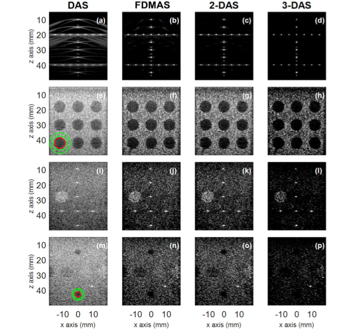 Figure legend: B-mode images (with single plane wave imaging) with four different beamformers: DAS, FDMAS, 2-DAS, and 3-DAS. On numerical phantoms (a–d) for the resolution and (e–h) for the contrast. On experimental phantoms (i–l) for the resolution and (m–p) for the contrast.