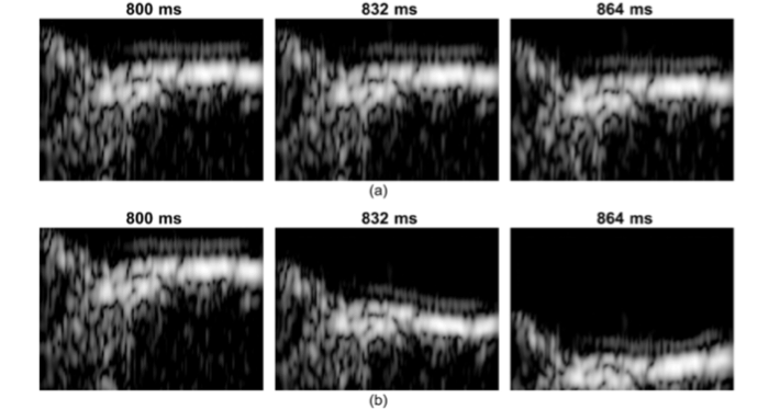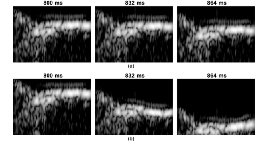 Figure Legend: Demonstration of video magnification applied to medical ultrasound imaging for one example with ultrasound (carotid). Close-up views of the distal wall are presented over time at 800, 832 and 864 ms after the beginning of acquisition. Upper row (a) is the original US images and the lower row (b) is the magnified data. Radial motion, due to the propagation of a pulse wave, is only visible on the magnified data (b).