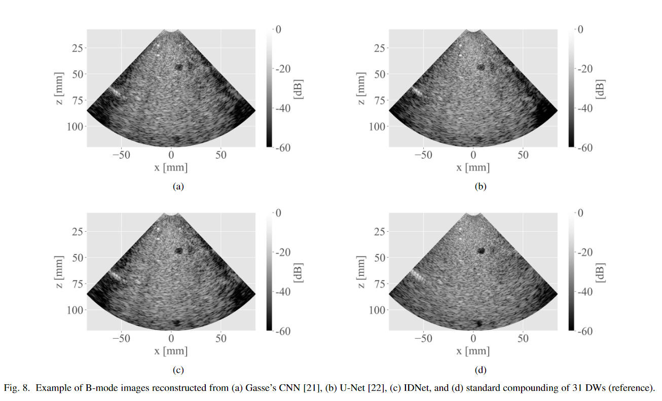 Il s’agit d’un travail de recherche mené conjointement avec le partenaire Harbin Institute of Technology. Le travail s’inscrit dans le cadre de l’imagerie par ultrasons à ondes divergentes (DW). Il propose une architecture de réseaux neuronaux convolutifs (CNN) pour la reconstruction haute qualité d'images échographiques DW à partir d'un petit nombre de transmissions (IDNet ci-dessous).
