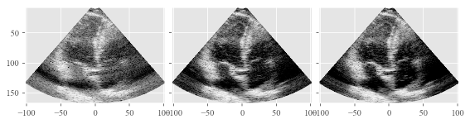 Reconstruction of a cardiac image using (a) 3 DWs and standard compounding, (b) 3 DWs and the proposed complex CNN. (c) is the reference image using the standard compounding of 31 DWs