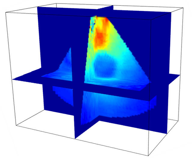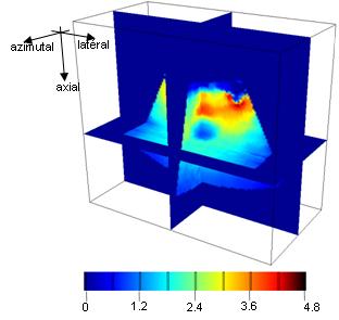 Estimated axial strain volume is shown in the following image. In spite of the free-hand acquisition, the whole volume is correctly estimated and the inclusion is clearly detected.