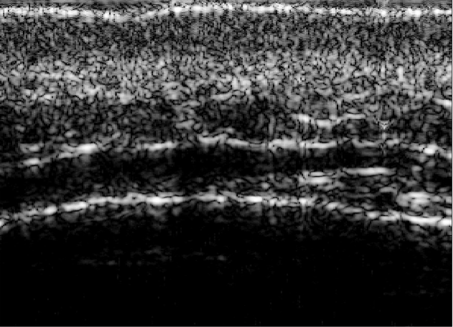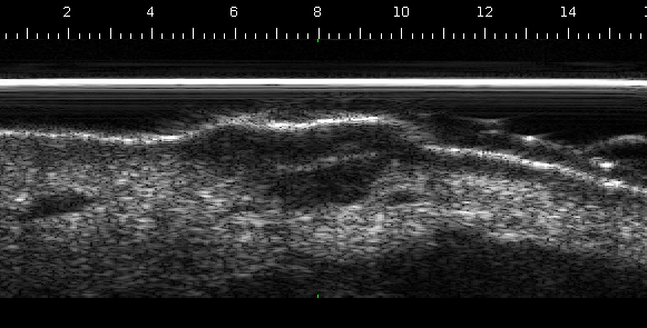 | Skin layers: epidermis, dermis, subcutaneous tissues, 25MHz | Kidney of a mouse, 25MHz |