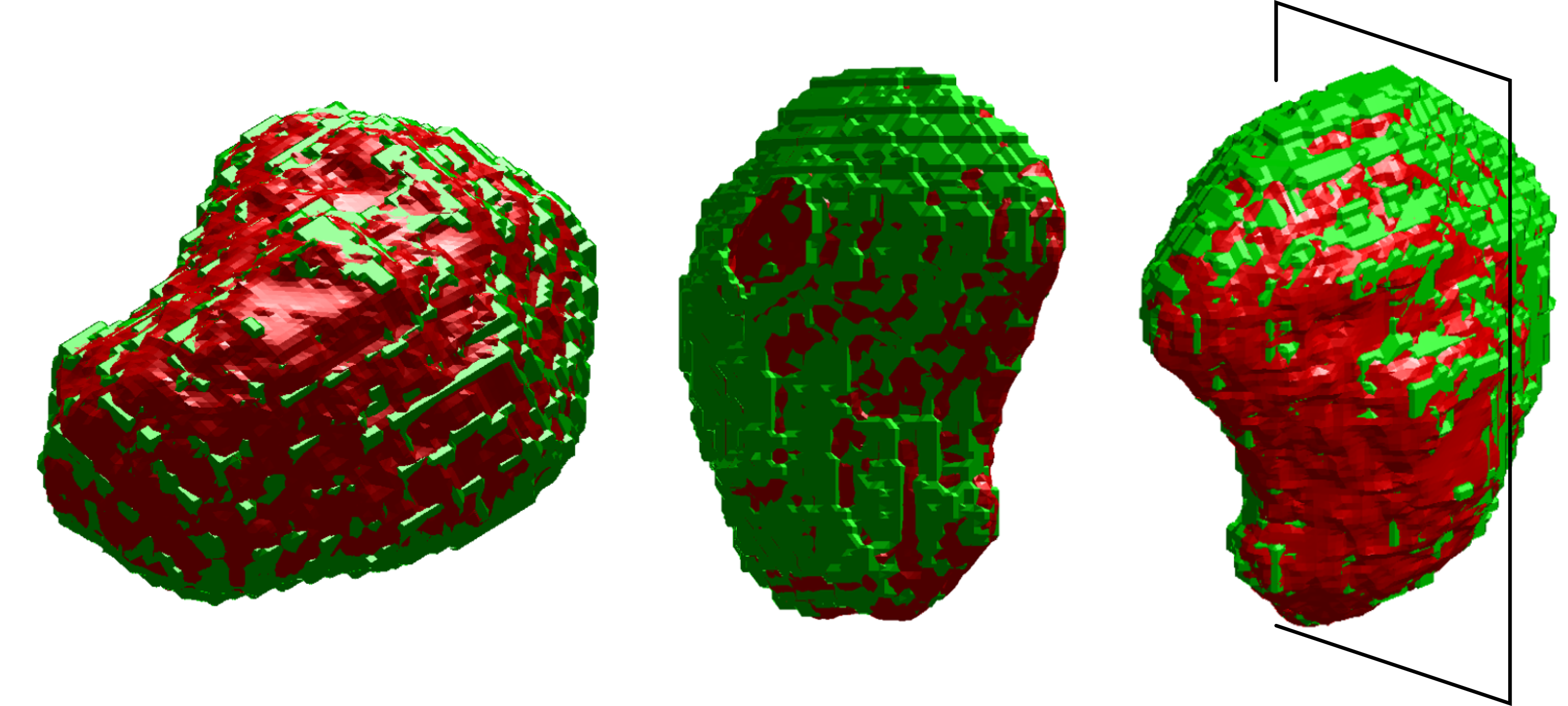| Illustration of the successive contour refinement at different scales | Shape of a segmented tumor in synthetic images. Red: reference volume. Green: results of the segmentation. |